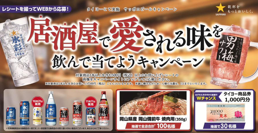 - タイヨー×サッポロビール共同企画『居酒屋で愛される味を飲んで当てようキャンペーン』(11/21まで)