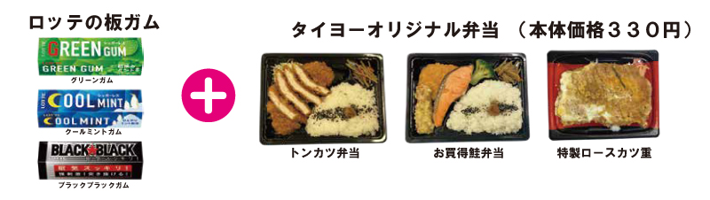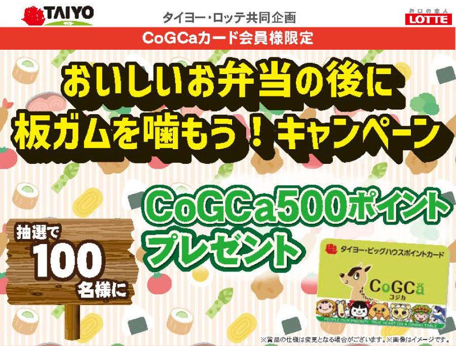 期間中に、タイヨーにて販売中のキャンペーン対象商品、「板ガム」1品以上と「本体価格330円のお弁当」1品以上を同時購入していただいた方の中から、抽選で100名様にCoGCaポイントを500ポイントプレゼントいたします。