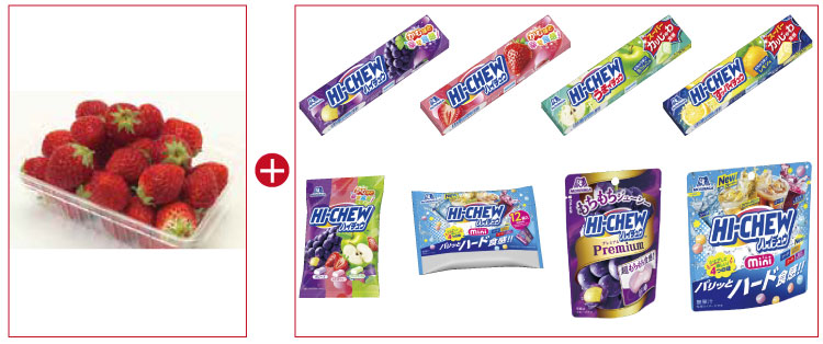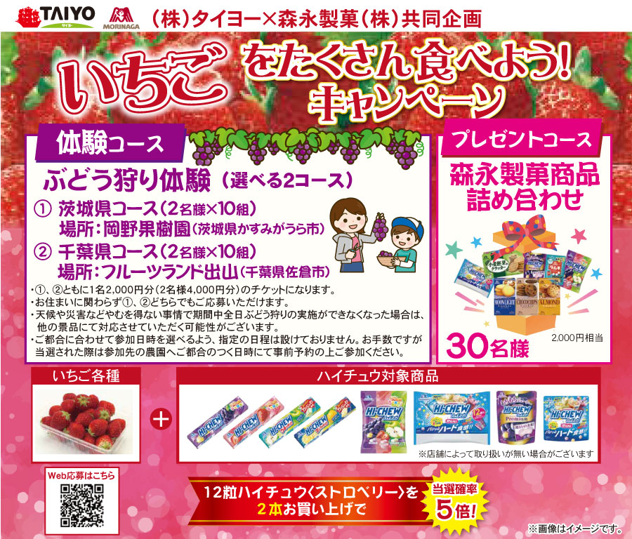 期間中に㈱タイヨーにていちごと森永製菓㈱の対象商品のお好きなハイチュウ1品をそれぞれ含む500円(税込)以上お買い上げいただいた方の中から抽選でプレゼント!