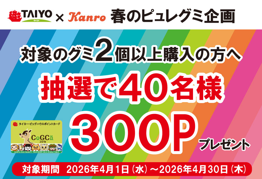 - タイヨー×Kanro共同企画『春のピュレグミ企画キャンペーン』(4/30まで)