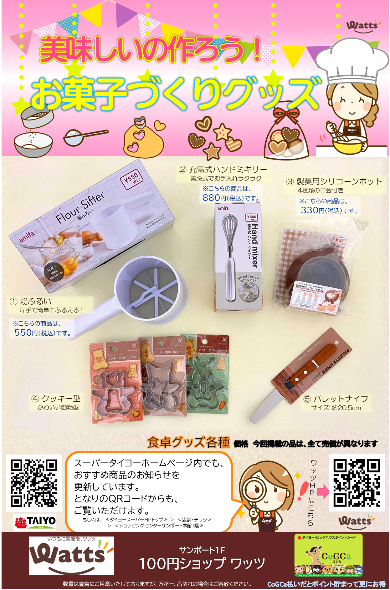 サンポート1F 100円ショップワッツから お菓子づくりグッズのお知らせです。