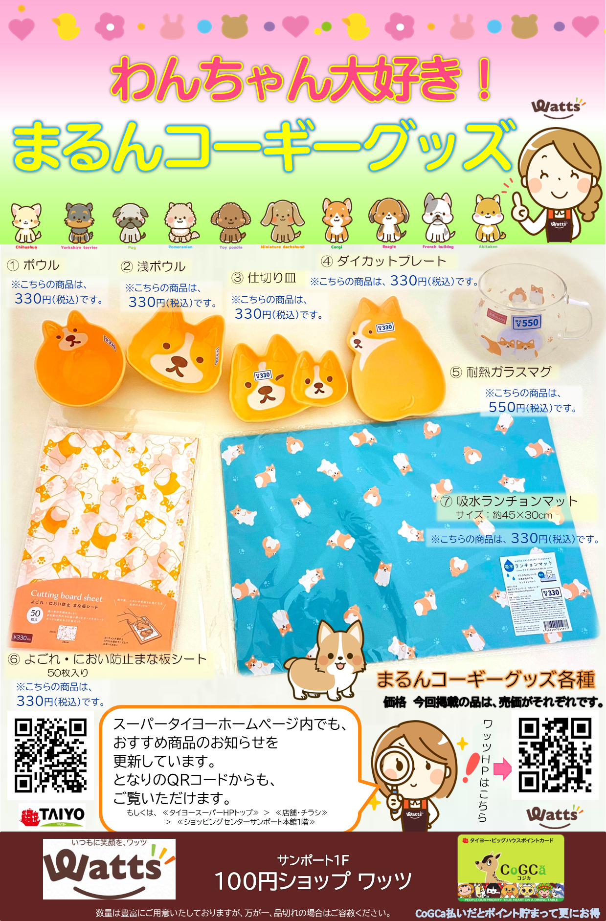 サンポート1F 100円ショップワッツから まるんコーギーグッズのお知らせです。
