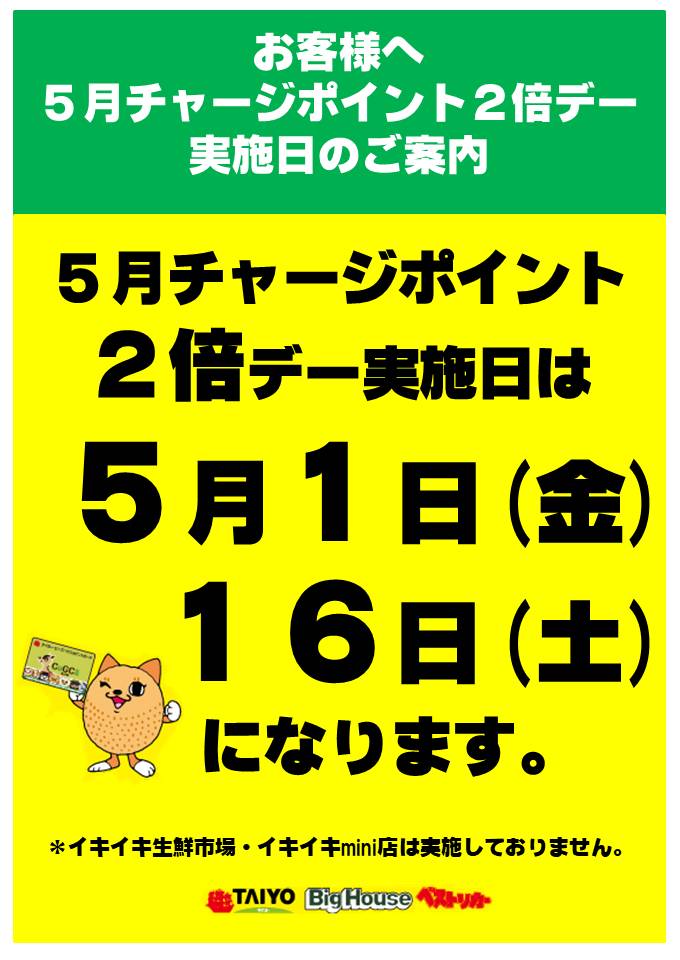5月1日・16日チャージポイント2倍デー実施!