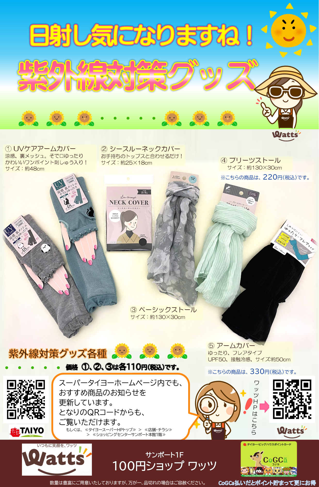 サンポート1F 100円ショップワッツから 紫外線対策グッズのお知らせです。