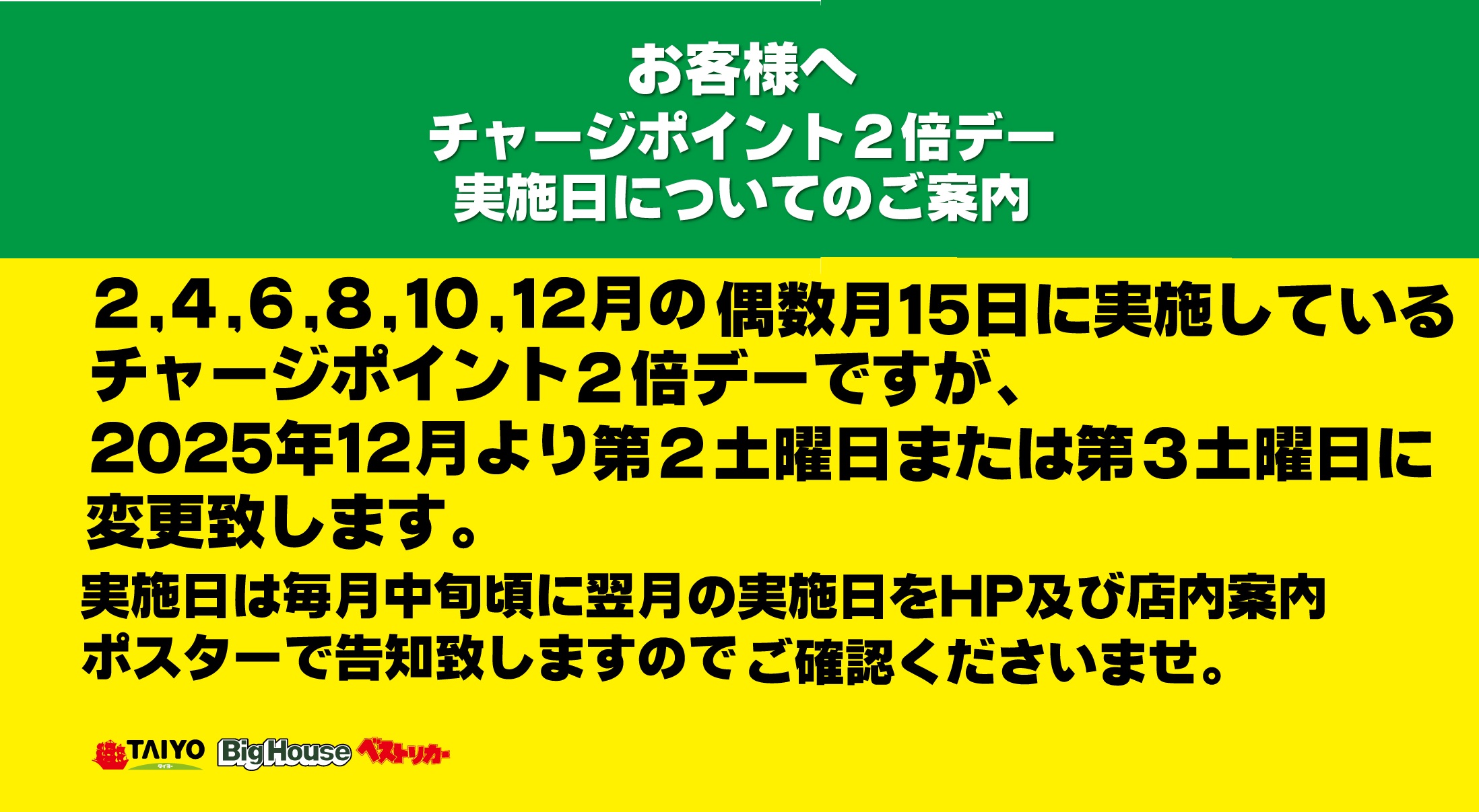 【重要なお知らせ】チャージポイント2倍デー実施日変更