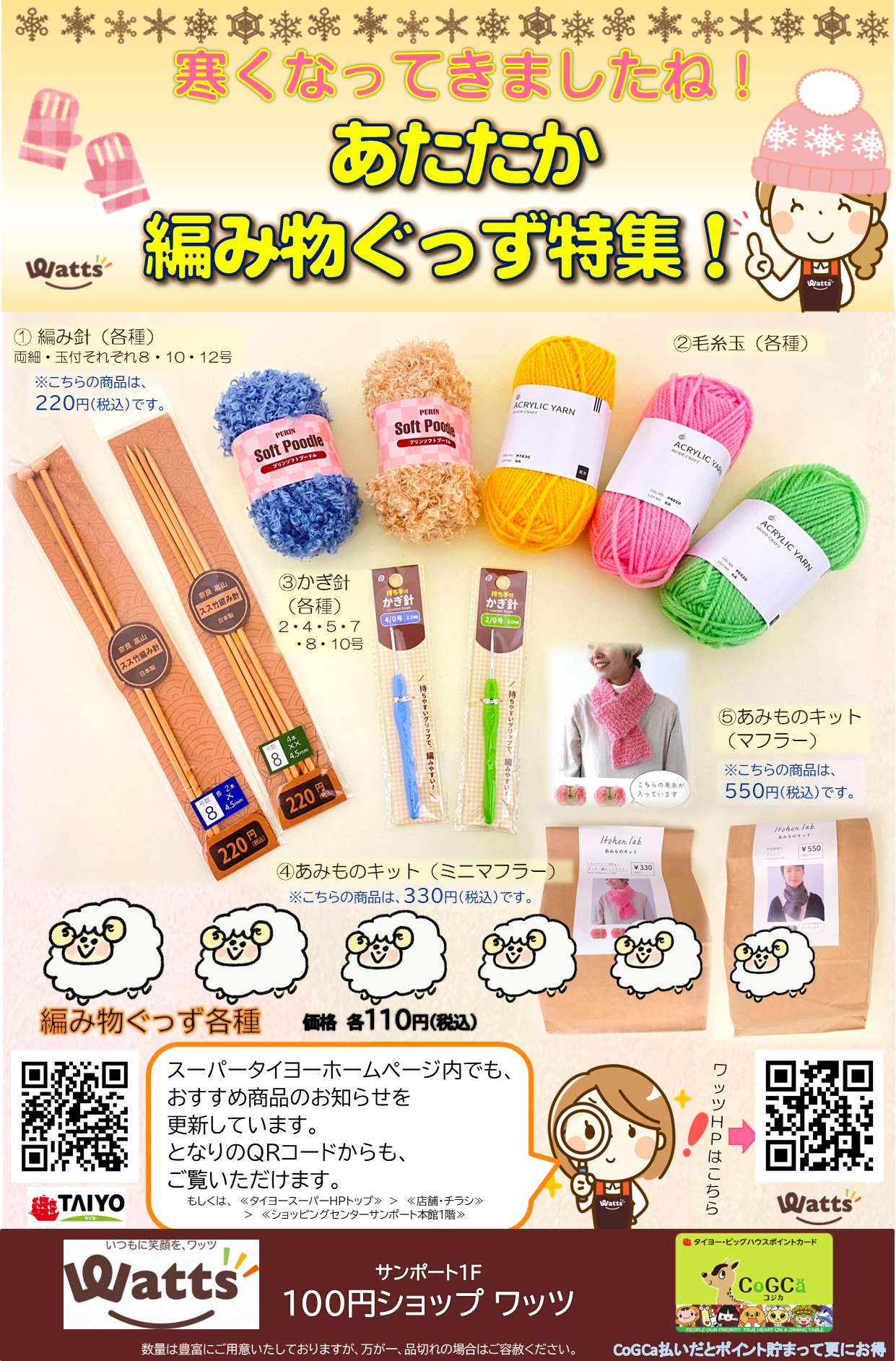 サンポート1F 100円ショップワッツから あたたか 編み物ぐっず特集!のお知らせ