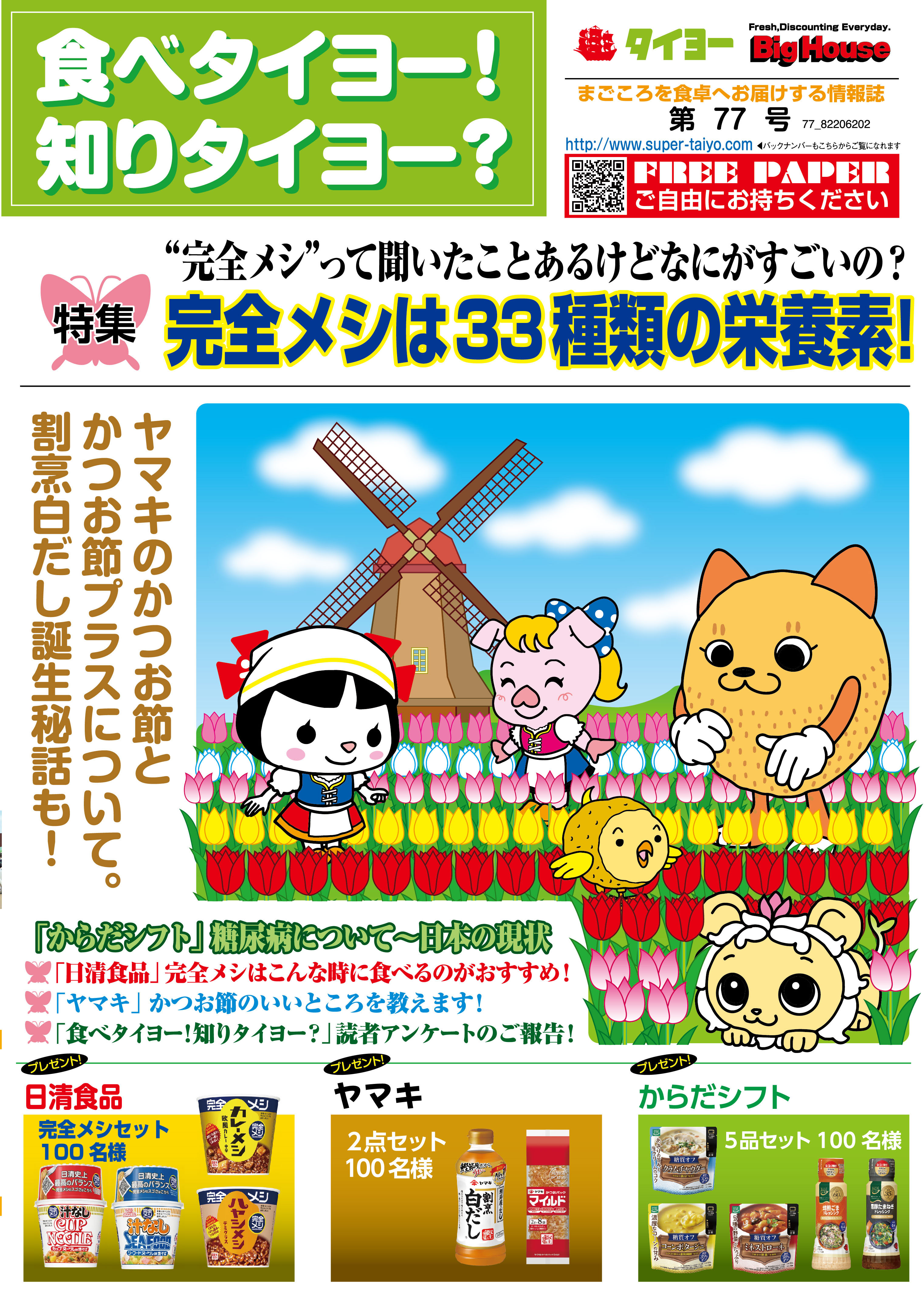 皆様お待ちどうさまでした!「食べタイヨー!知りタイヨー?第77号」が発行されました。第77号では、健康管理に役立つ商品をご紹介しています。★「日清食品」完全メシはこんな時に食べるのがおすすめ!★「ヤマキ」かつお節のいいところを教えます!★「からだシフト」糖尿病について~日本の現状★「食べタイヨー!知りタイヨー?」読者アンケートのご報告!是非ご覧になって下さい。